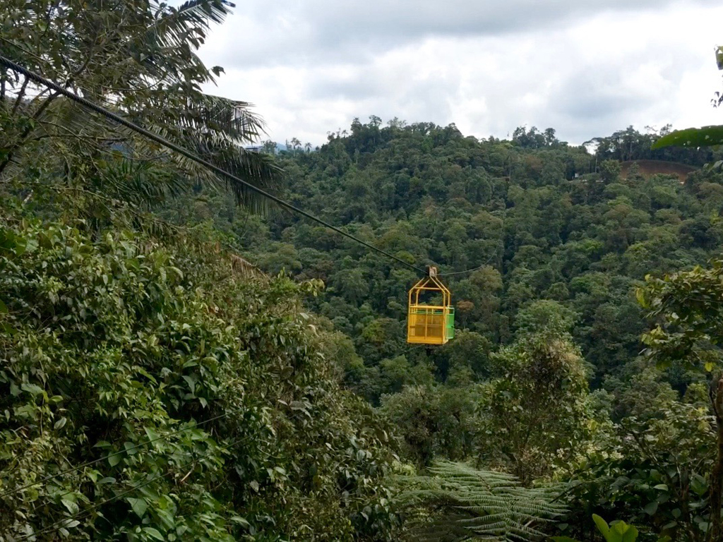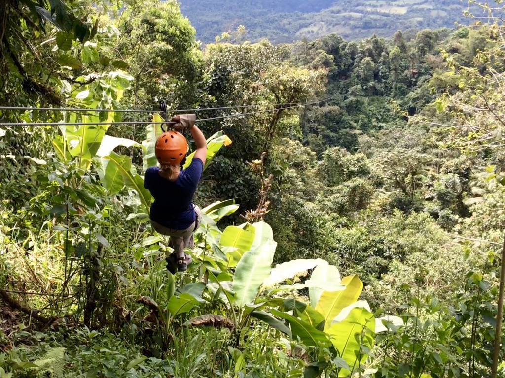 L’après-midi, place à la canopy adventure, une série de tyroliennes plus ou moins longues qu’on peut emprunter de manière classique, ou alors la tête en bas ou version superman ou superchica, très drôle (mais ça fait mal) ! Le soir, c’est avec ¼ de poulet chacun (ou presque) que nous nous couchons, avant d’entamer, après la visite de la ferme à papillons, le voyage vers le parc national Cotopaxi…