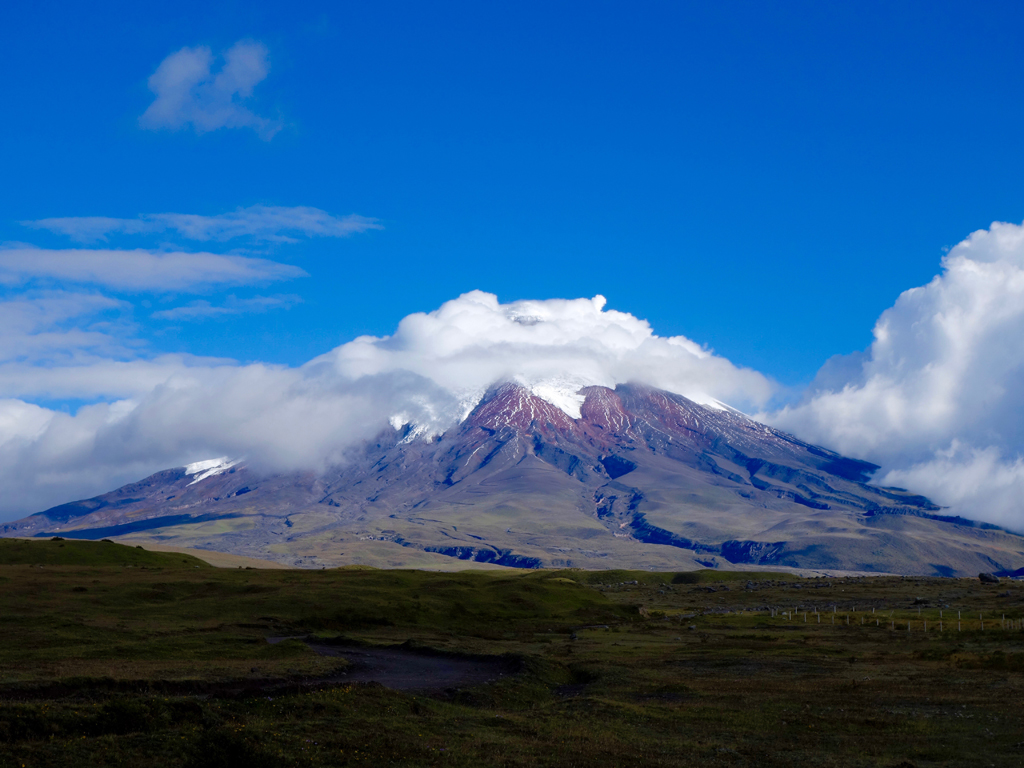 Le temps s’étant calmé, nous décidons de faire une promenade jusqu’à l’entrée du parc et là : spectacle tadààààà ! Le volcan Cotopaxi (5897m) a décidé de se montrer sous toute sa splendeur avec son dégradé de couleurs, à partir du vert des prairies à la base, en passant par les roches rouges et pour finir avec le blanc du glacier recouvrant la pointe, ce qui, avec le ciel bleu, compose un vrai tableau.
