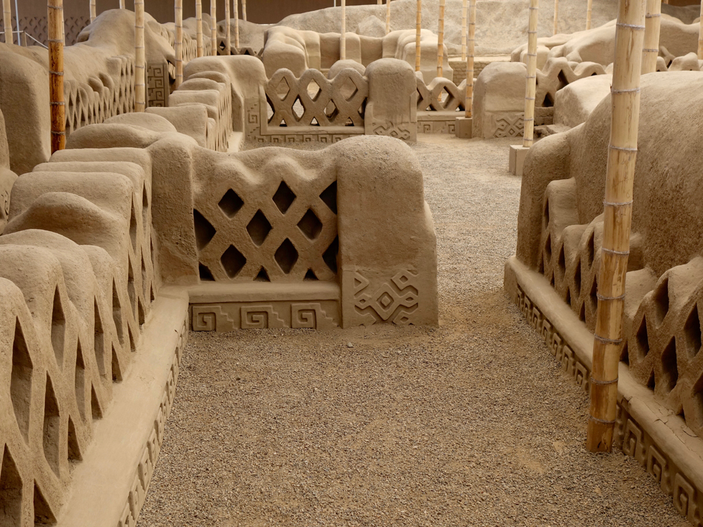 Nous avons fait, sans guide, la visite du palais Tschudi, la seule partie restaurée de ce complexe gigantesque qui est pour le reste malheureusement fortement dégradé (saleté de biques d’adobe). Cette construction est différente par rapport aux temples Mochica, les bas-reliefs colorés faisant place à des reliefs géométriques et à un bestiaire retraçant la culture Chimú.