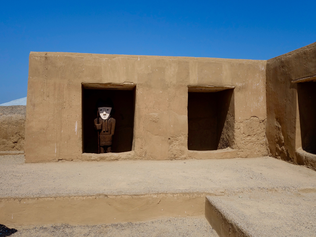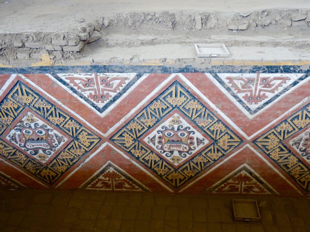 Ayant été érigées en briques d’adobe, le temps et la pluie ont bien dégradé les temples (ça ressemble à un tas de briques recouvert de sable). Du coup, uniquement la Huaca de la Luna, le plus petit des deux, peut être visité, accompagné d’un guide inclus dans le prix de l’entrée. Ce temple se compose de différents niveaux, édifiés chacun par une autre génération en remplissant le précédent avec des briques et en construisant le nouveau, plus grand, en dessus. Les archéologues ont découvert, et découvrent chaque année, de très belles frises polychromes ainsi que des représentations diverses et des poteries exposées ensuite dans le musée.