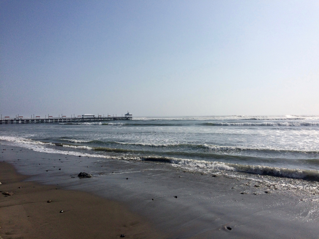 Suite à la visite de Chan-Chan, nous prenons la direction de la plage et l’océan pour un après-midi farniente avant le prochain bus de nuit. Huanchaco est une petite station balnéaire prisée des surfeurs (au vu des vagues, on comprend bien). Si la plage de sable gris, n’est pas vraiment paradisiaque, nous profitons tout de même tremper les pieds et observer les surfeurs débutants se casser la figure.