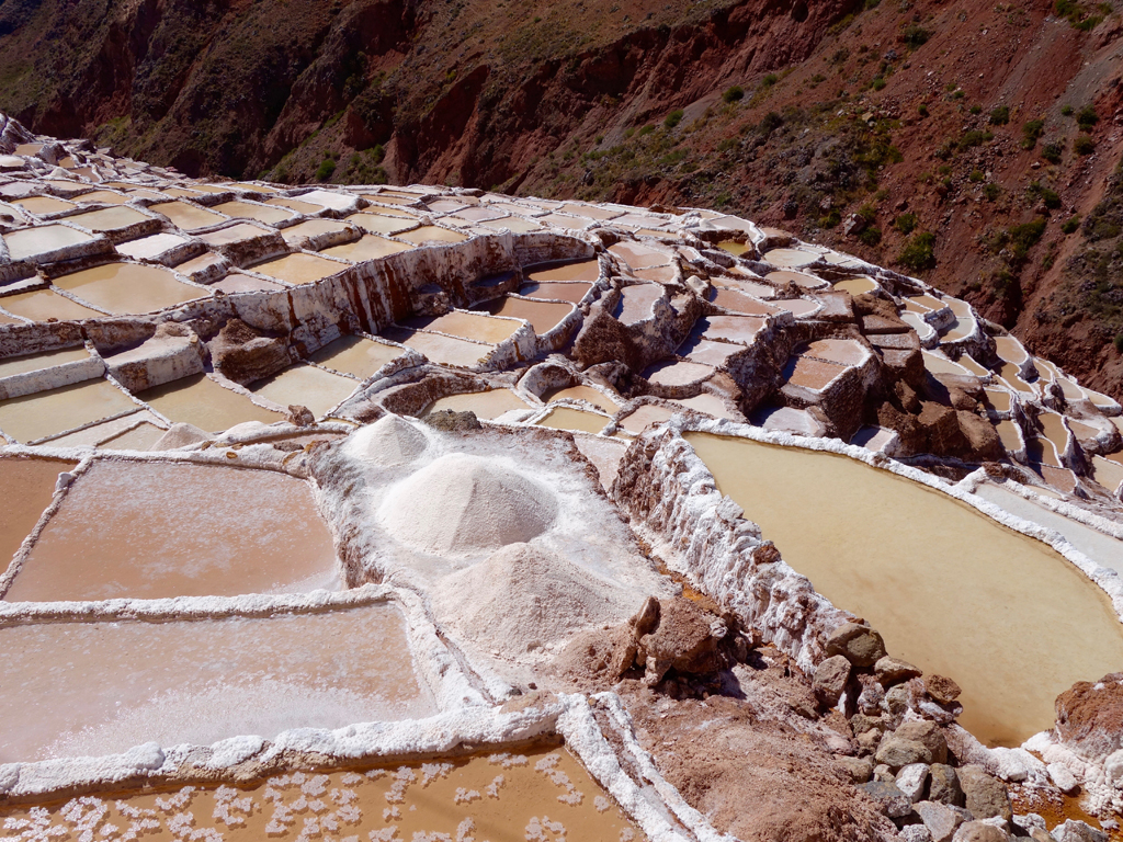 Pas de ruines inca cette fois-ci, mais des splendides salines situées dans une petite vallée de montagne. Les différents bassins construits en terrasse forment une jolie composition avec leurs reflets et les petits ruisseaux qui les alimentent (un ruisseau salé est le point de départ de ces bassins). Nous nous éloignons du début ou s’entassent la plupart des tous les gens pour trouver un coin tranquille pour picniquer, toujours avec vue sur les salines bien entendu (et même en utilisant un petit échantillon de sel pour assaisonner notre avocat…).