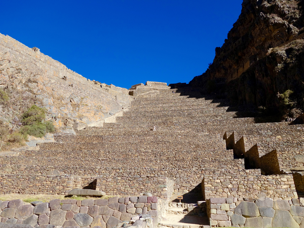Trois changements de minibus plus tard, nous arrivons dans ce village au nom simple à retenir où nous avions prévu de passer la nuit. Il faut savoir que ce dernier a gardé le plan inca d’origine, avec les petites ruelles pavées et même le système de canalisation de l’époque! Et c’est très beau! Nous trouvons un petit hospedaje tout mignon et décidons de profiter d’une terrasse de la place pour boire une bière au lieu de visiter les ruines… En effet Ollantaytambo est un point de départ du train pour le Machupicchu, ce qui fait que de nombreux tours s’arrêtent ici avant de poursuivre. Les ruines sont donc bondées tout l’après-midi, même si situées à l’ombre!