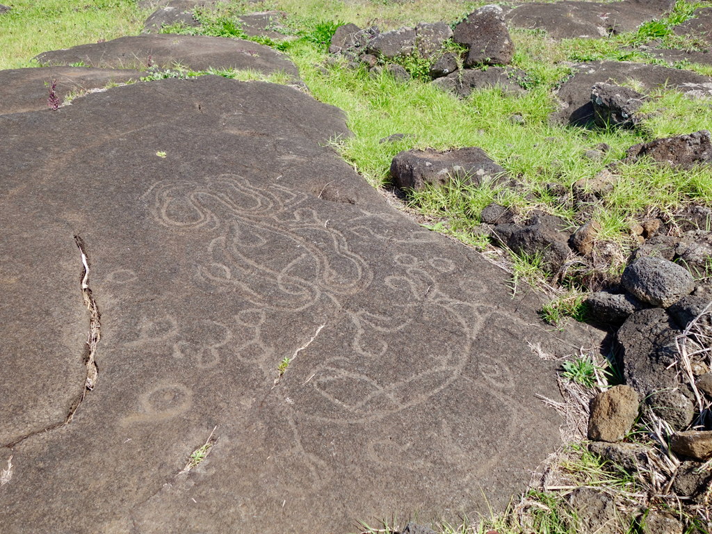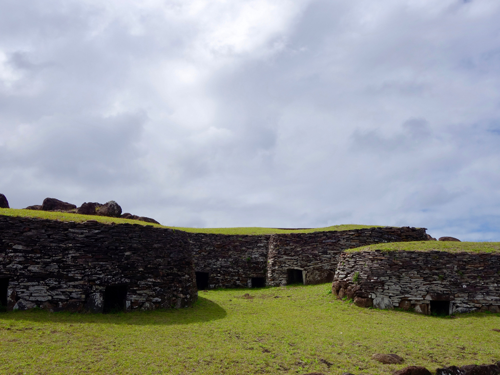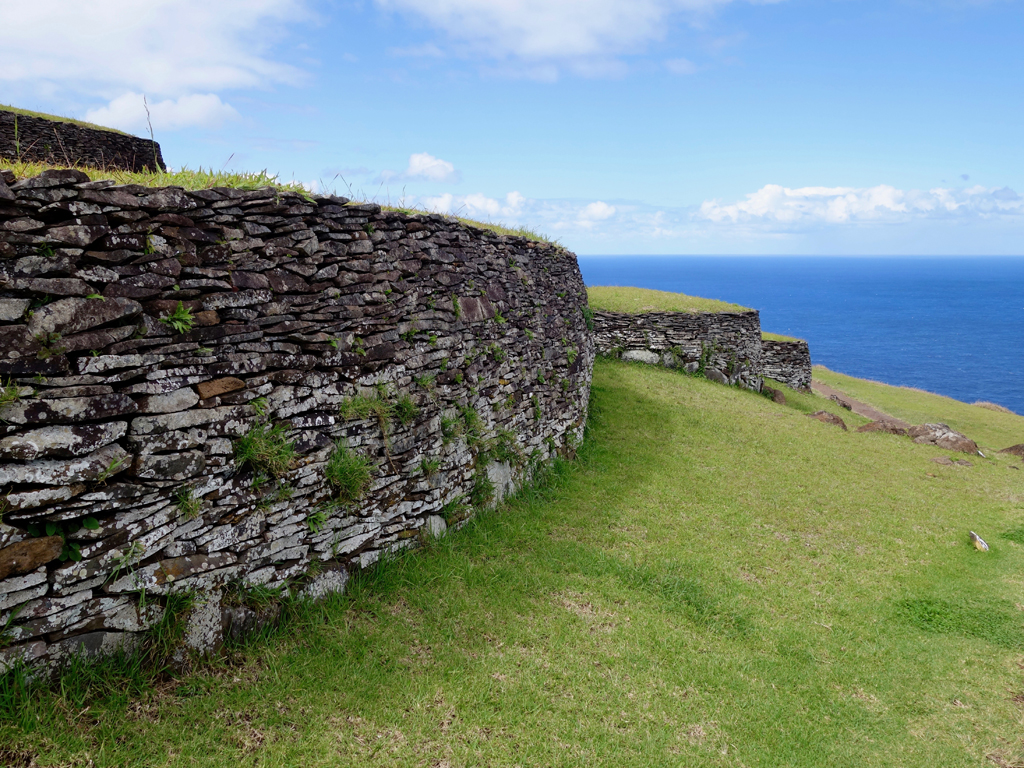 La compétition se faisait entre les élus des différentes tribus de l’île, les Hopus. L’ancien village était composé de maison ovales dont on peut bien reconnaître les fondations et dont certaines on été reconstruites. Il y a également des pétroglyphes à voir et bien sûr la vue sur le cratère d’un côté et sur l’océan de l’autre.