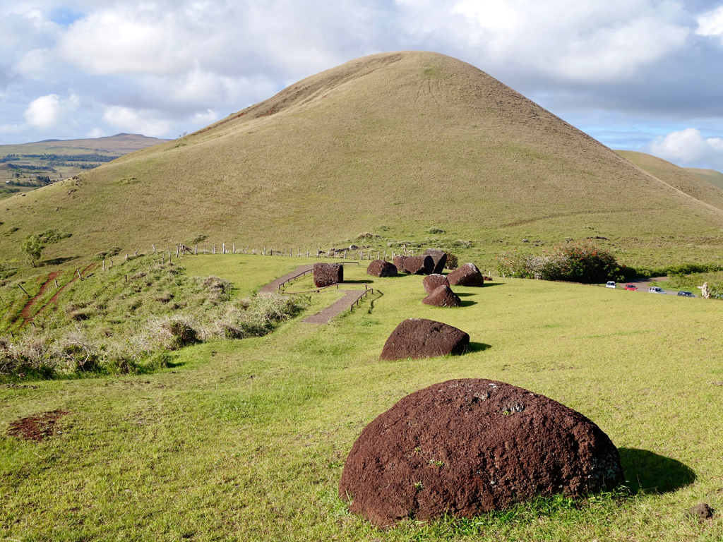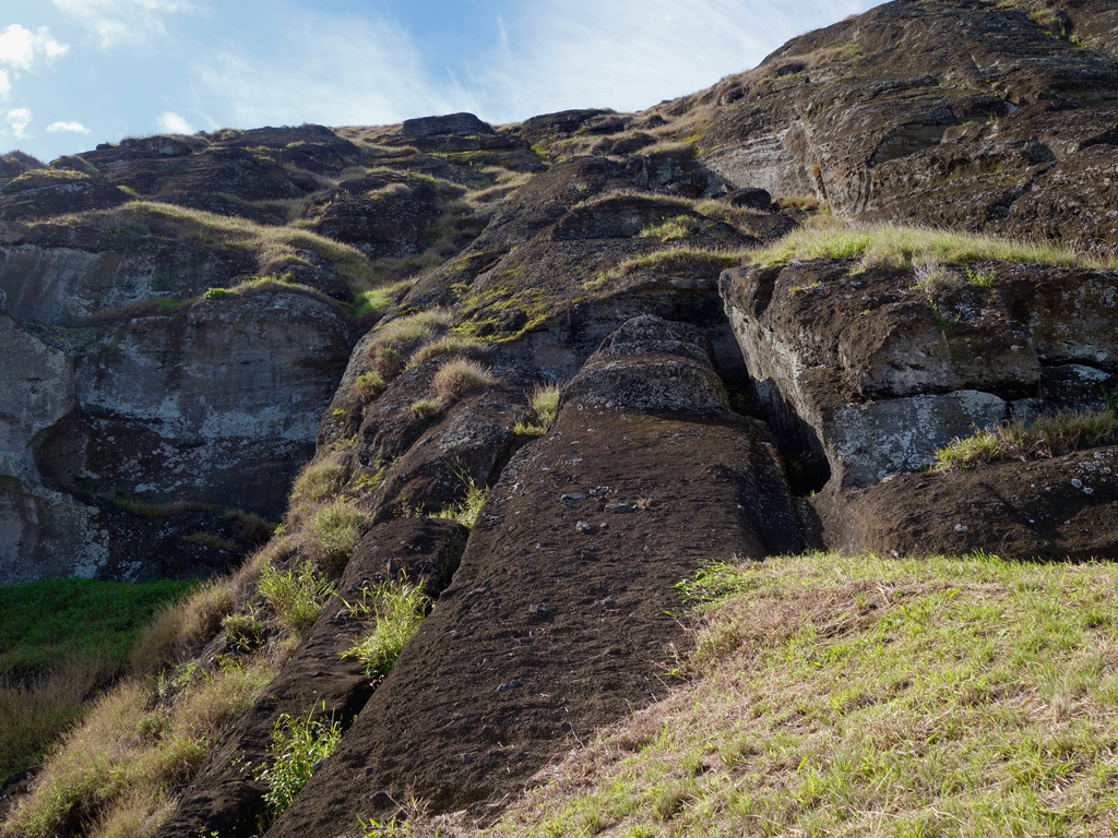 Ensuite nous arrivons à la fameuse carrière Rano Raraku, située un peu en hauteur, où les Moaïs étaient taillés avant d’être transportés sur les sites (on ne sait pas exactement comment, vu leur poids…).