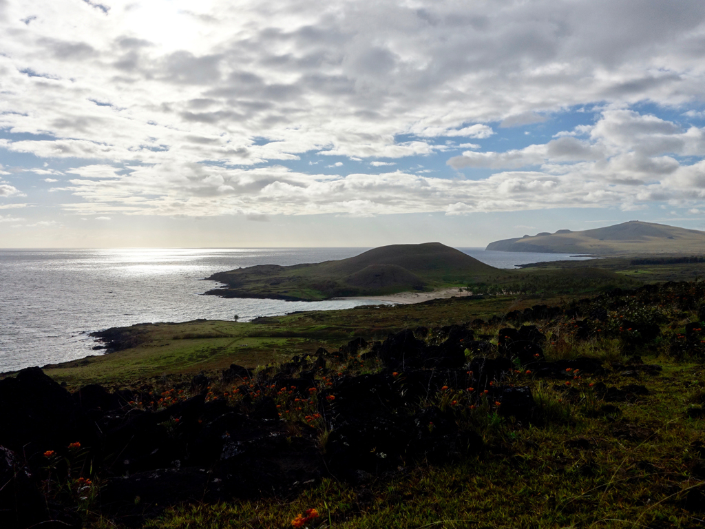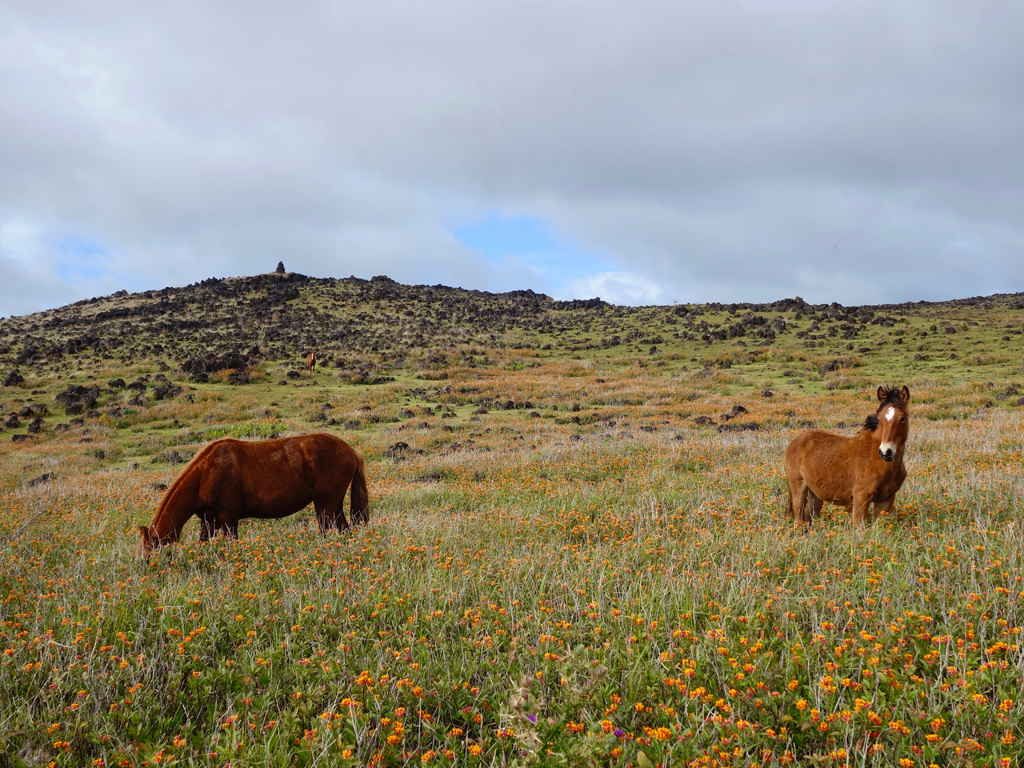 Nous continuons vers la plage Anakena avec l’idée de lézarder un petit peu, mais le ciel couvert et le vent nous aura fait changer de programme. La promenade sur une partie de la côte sauvage, accessible uniquement à pied, vaut la peine avec de nombreuses fleurs et des chevaux sauvages gambadant librement.