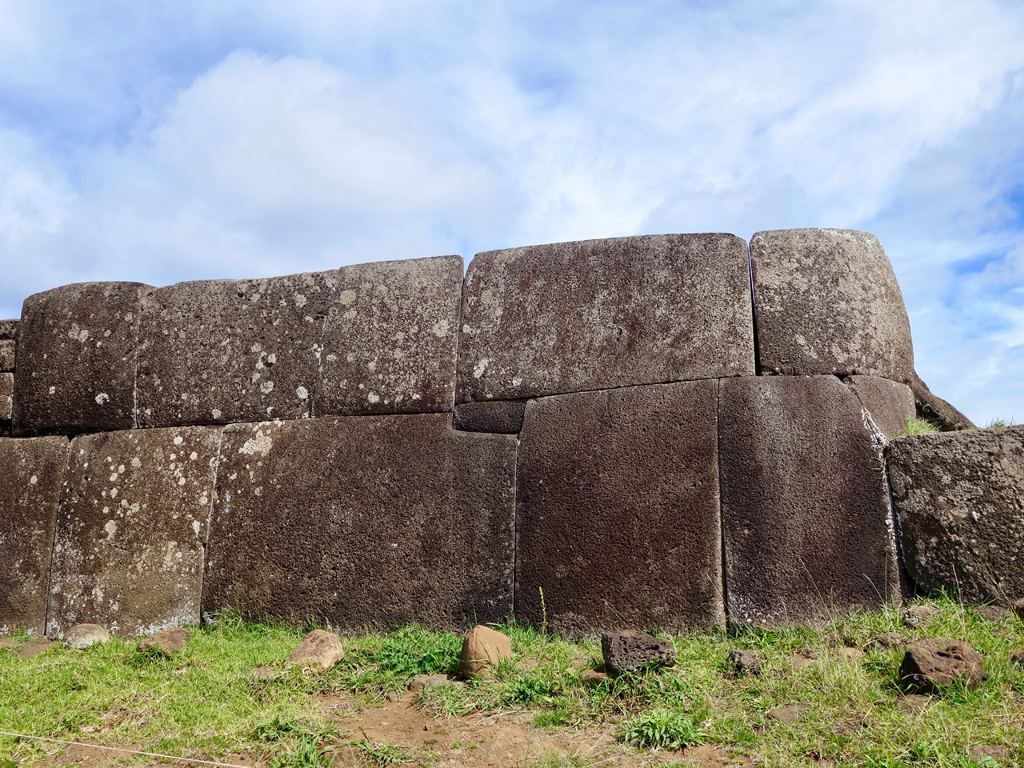 De retour au scooter, nous terminons nos visites par l’Ahu Vinapu situé à proximité de l’aéroport et connu pour son appareillage de pierres similaire à celle des Incas (seraient-ils arrivés jusque là…?).