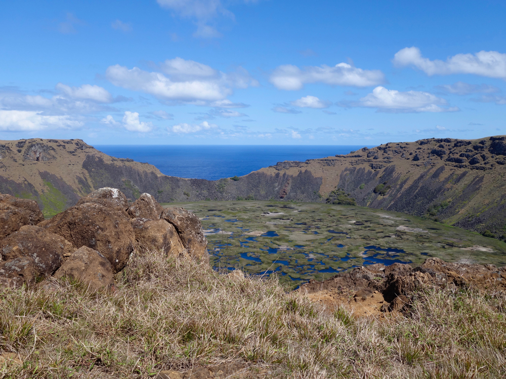 Une fois en haut, le spectacle est grandiose: un cratère rempli d’une lagune et d’une flore originelle préservée à base de roseaux avec une ouverture sur le pacifique. Magique! Par ailleurs, personne ne nous avait déjà parlé auparavant de cet endroit en relation avec l’île de Pâques.