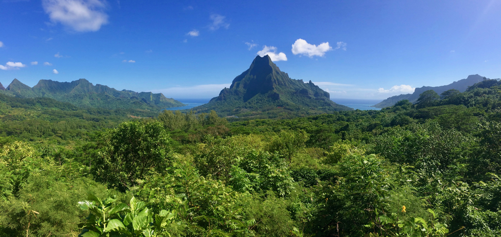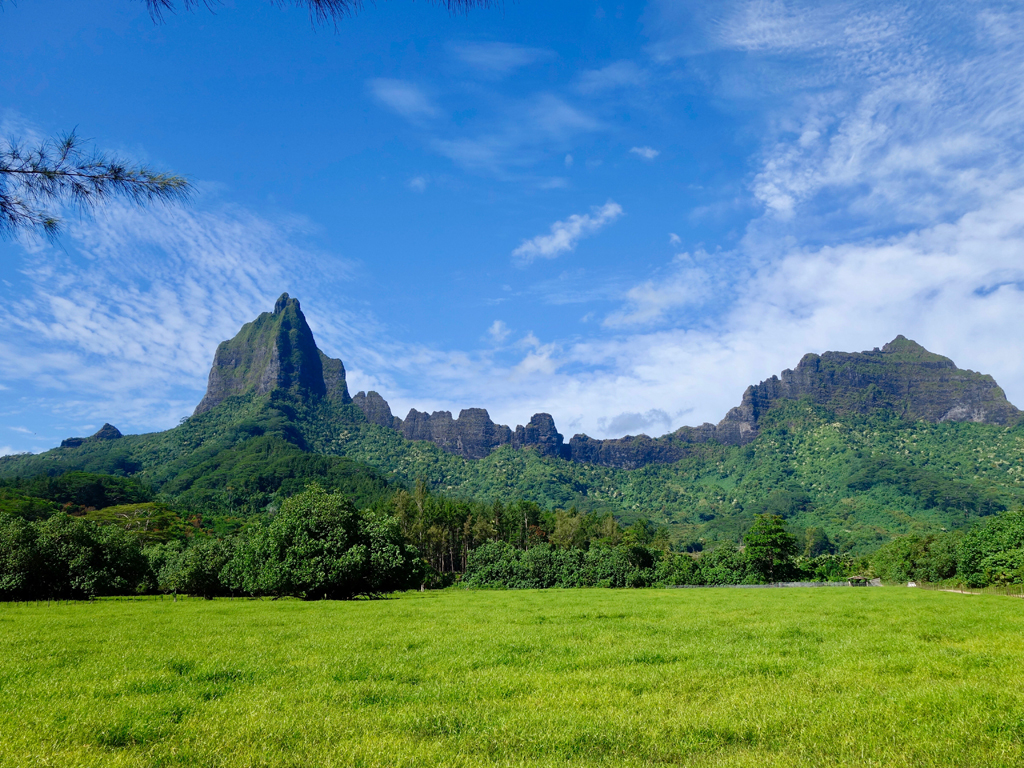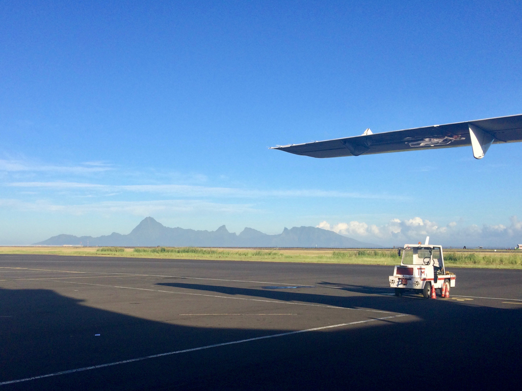 C’est après avoir dormi un peu plus de quatre heures que nous nous dirigeons vers l’aéroport pour prendre le vol le plus court de notre vie, soit 8 min chrono (!) de Tahiti à Moorea, son île voisine avec une silhouette hors du commun. Pas bien pour l’environnement direz-vous, mais le trajet étant inclus dans le pass inter-îles, nous n’allions quand même pas payer le ferry en plus…