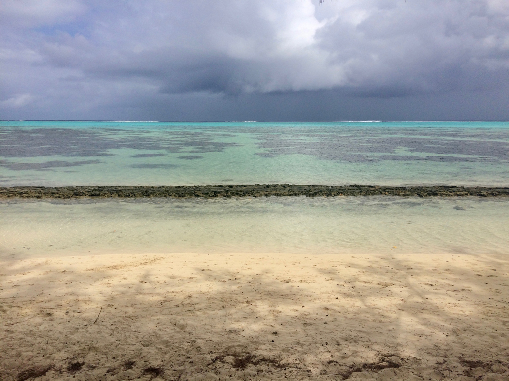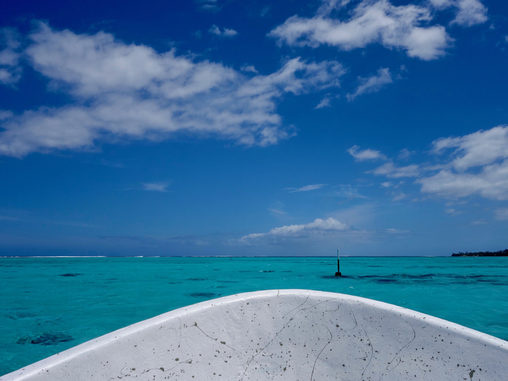 Le lendemain nous avions prévu de louer un scooter, mais il n’y en avait plus à disposition… Retour donc aux Tipaniers pour prendre un kayak et faire face au courant et au vent pour aller voir le spot des raies et des requins! Incroyable, plein de requins pointe noire (inoffensifs) et des raies qui sautent sur Melanie s’approchent de toi sans timidité pour se faire caresser (bon, avec les « guides » des tours organisés qui leur donnent à manger ce n’est pas vraiment étonnant…). Ce fut tout de même un moment magique! Pas de GoPro, pas de photos!