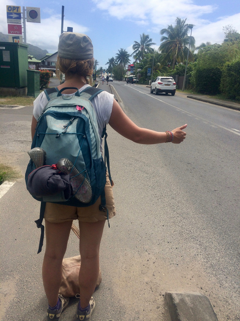 Une fois récupéré nos sacs sur une sorte de présentoir (oui, l’aéroport est petit), direction la sortie pour prendre un taxi hors de prix route principale pour faire du stop afin de rejoindre le camping situé de l’autre côté de l’île. Évidemment nous étions les seuls, les autres ayant tous un transfert prévu par les hôtels respectifs. À peine 5min plus tard, un jeune polynésien s’arrête et nous pousse jusqu’à chez lui, à quelques kilomètres de là, en longeant la côte baignée par le splendide lagon. Mais attention, il propose même d’attendre qu’il range ses courses pour poursuivre encore un peu plus loin avec lui, le tout avec un verre d’eau, une dégustation du jackfruit plus un sac avec un pamplemousse, une papaye et un … corossol! Si ce n’est pas de l’accueil ça! Après deux autres stops, nous voilà arrivés au fameux camping, le seul de l’île et qui n’a en plus pas très bonne réputation au niveau de la bienvenue…
