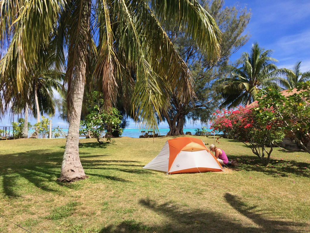 Comme il est encore tôt, nous nous dirigeons vers la plage de l’hôtel Tipaniers, pas loin. Avec les deux motus (îlots) en face et le somptueux lagon, c’était le lieu idéal pour se poser un peu, avant de rejoindre Jennifer et Damien (rencontrés à Tahiti) pour le dîner dans un snack au bord de l’eau. Au menu: tartare de thon et mahi mahi pané au lait de coco. Un vrai délice! La journée s’est ensuite vite terminée et nous étions prêts pour la première nuit sous tente dans un pays chaud! Spolier: c’est trop cool de ne pas avoir froid.