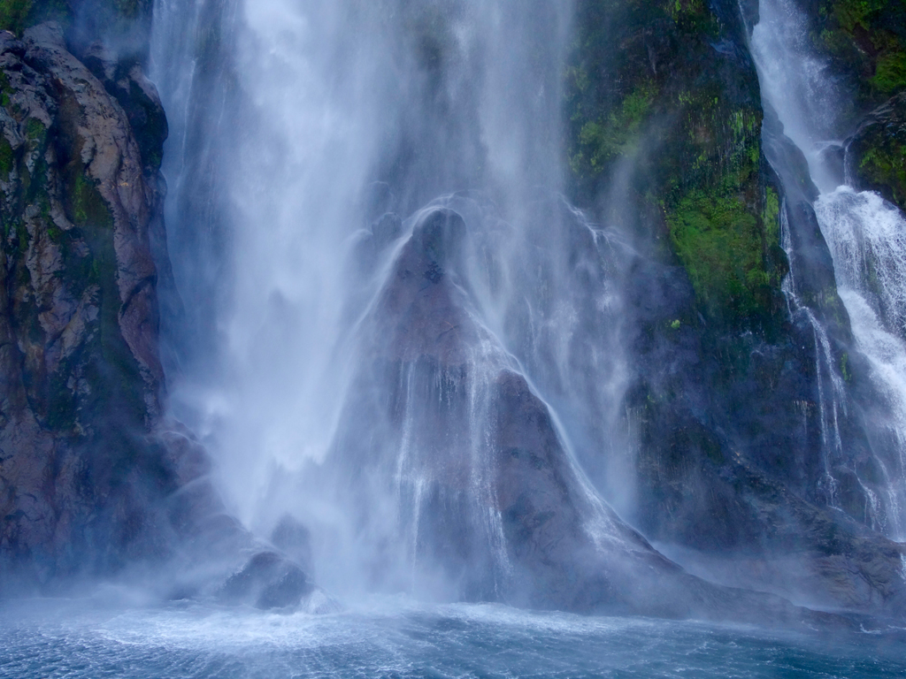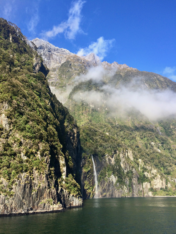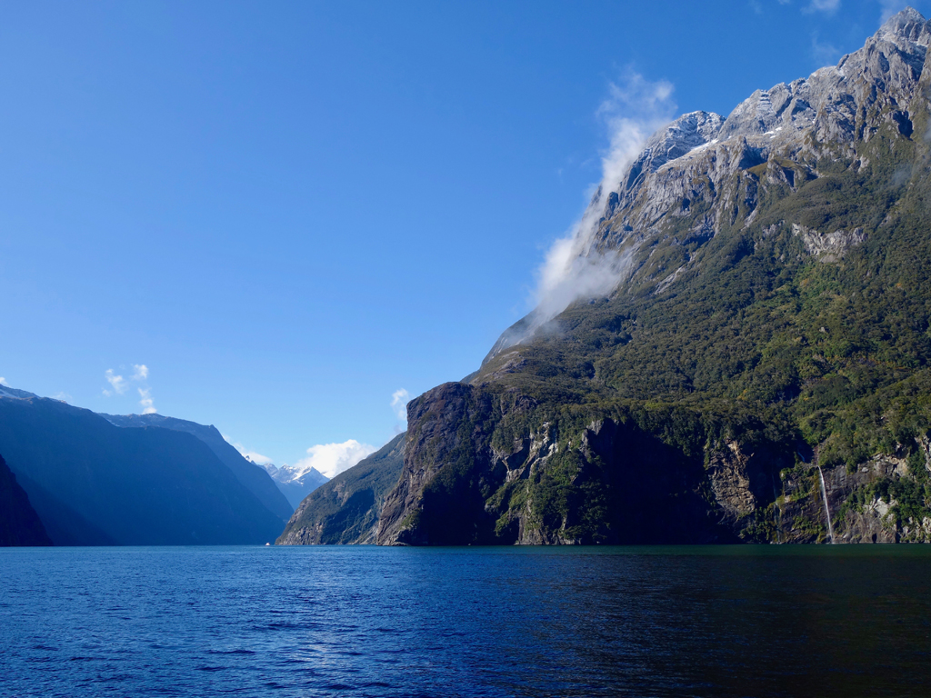 A bout de la route, nous sautons dans notre gros bateau qui propose du thé gratuitement. Une fois partis, nous montons sur le pont supérieur et pouvons admirer le panorama incroyable qui s’offre à nous, c’est spectaculaire ! Il fait frais, mais après la Bolivie tout est faisable… Le soleil se lève sur le fjord, nous passons des cascades, voyons des otaries à fourrure et admirons ces falaises végétales. Vers l’embouchure avec l’océan ça commence à secouer un peu (pour le plus grand plaisir de Melanie) et nous pouvons remarquer que depuis l’océan, le fjord n’est pas visible. (D’ailleurs le capitaine Cook ne l’avait pas vu lui non plus).