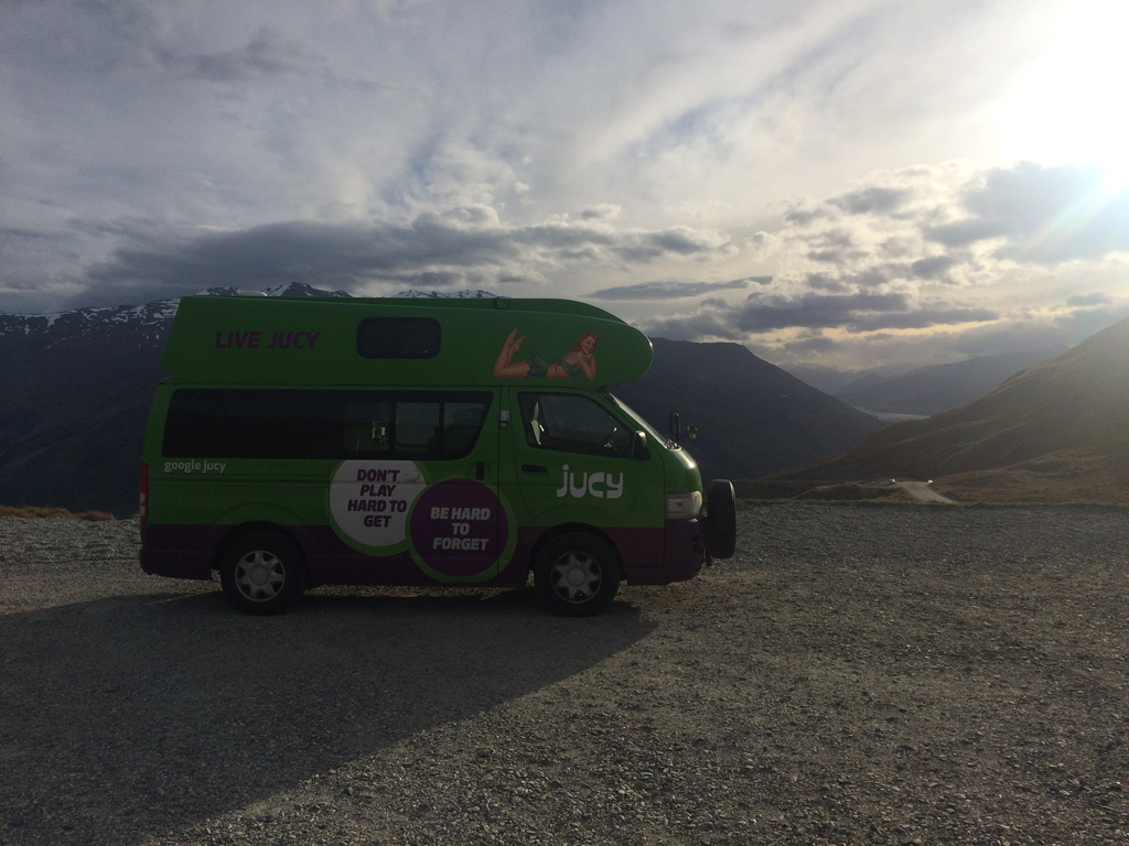 Connue comme LA ville pour pratiquer des sports extrêmes et faire la fête, Queenstown se situe au bord d’un lac que l’on longe tranquillement pour la rejoindre. La saison de ski étant finie et n’ayant pas trop le budget pour faire des sauts en parachute ou du rafting, nous nous contentons de nous promener au centre. Et comment dire… nous n’aimons pas. Ça ressemble un peu à St-Moritz en moins chic, situé dans un joli cadre certes, mais avec plein trop de boutiques, hotels et restaurants pour touristes. Nous décidons donc de poursuivre en direction de Wanaka en s’arrêtant sur un col à 1076m pour passer la nuit. Grave erreur ! Les rafales de vent sont tellement fortes que nous avons de la peine à dormir ne dormons pas, le tout sous la pluie bien évidemment.
