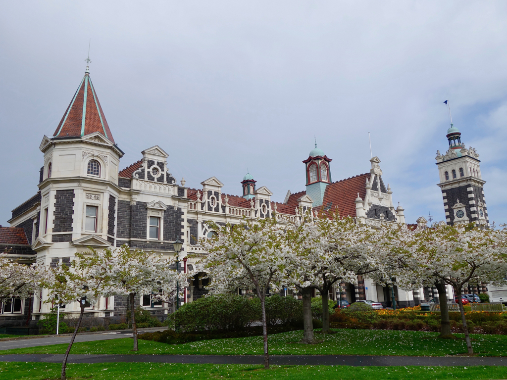 Grande ville du Sud, l’arrêt s’y imposait pour une nouvelle dégustation de bières (les Speight’s, répandues dans toute l’île), ainsi que d’un bon burger dans le centre, mais qu’est-ce qu’on vit sainement. La ville en soi dégage une atmosphère printanière tranquille, peut-être que le soleil qui a décidé de réapparaître à ce moment a aidé. Une fois rassasiés et désaltérés nous visitons la gare, charmant édifice bordés d’arbres en fleurs et clairement le highlight architectural.