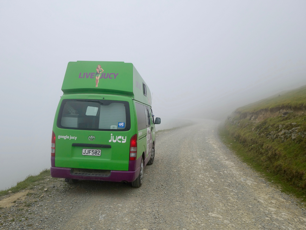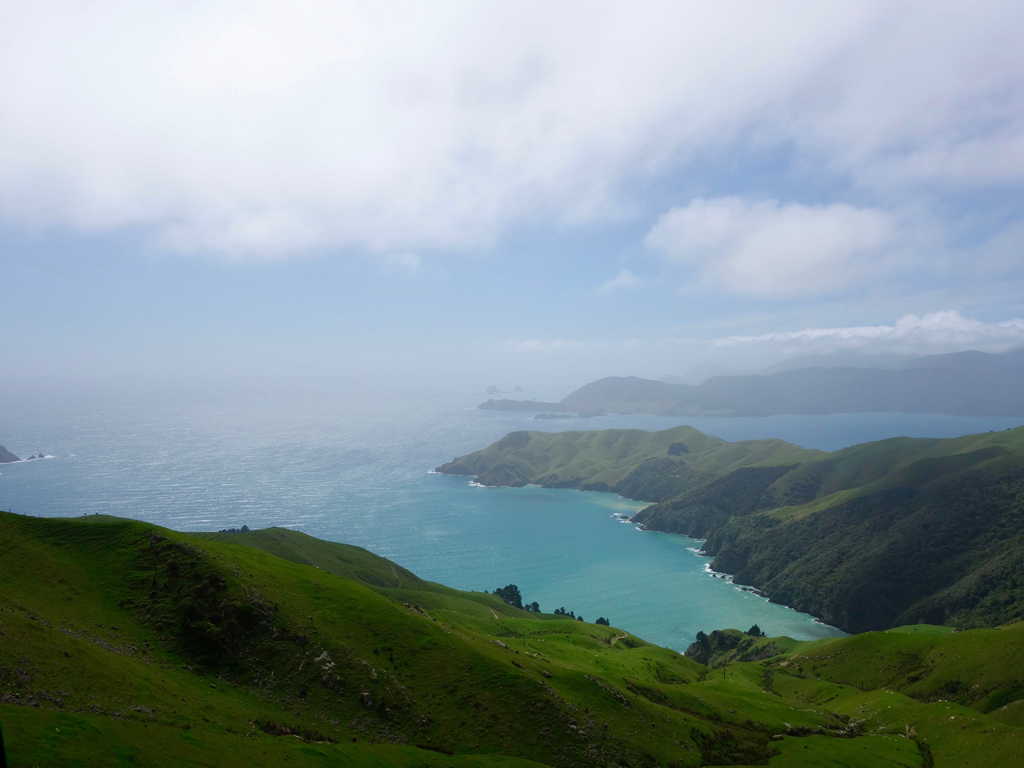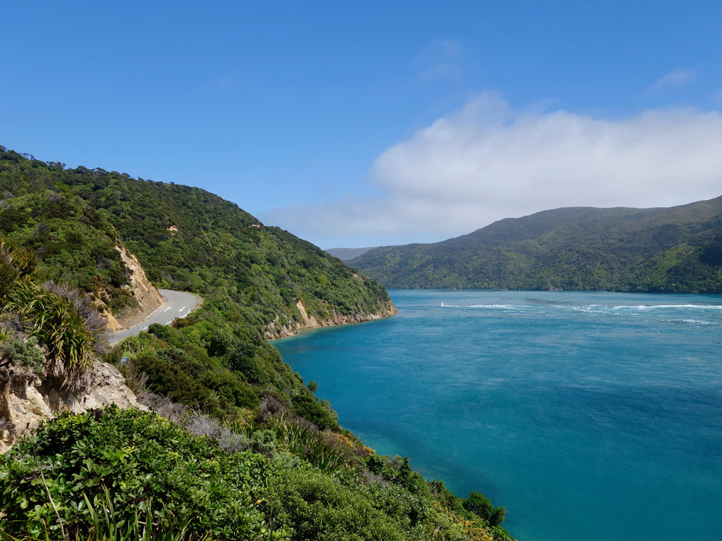 Nous prenons la décision d’aller visiter French Pass, sur conseil du barman de Nelson. La route qui débute dans le brouillard, avec nombreux virages et en perdant un enjoliveur, en grande partie non asphaltée peu en décourager certains. Pas nous, car une fois le brouillard dissipé elle nous éblouit avec les paysages fantastiques des Marlborough Sounds. Eaux bleues, collines verdoyantes, moutons et océan au loin… Nous dînons sur place et au retour nous nous arrêtons à Renwick pour dormir sur le parking d’un centre sportif.