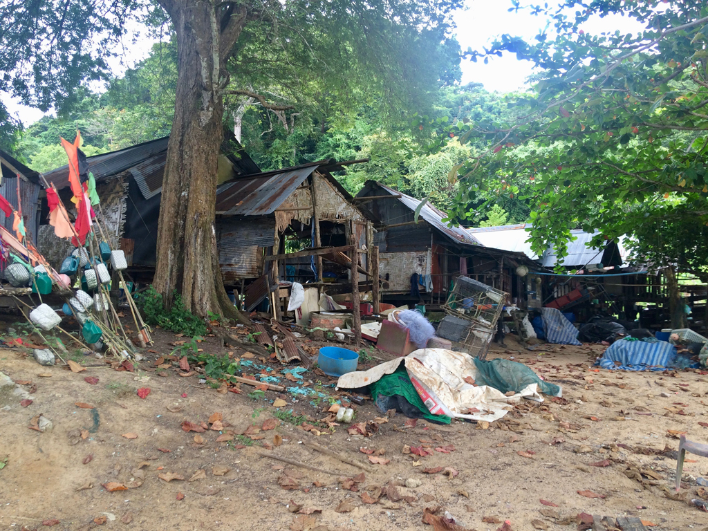 De la plage principale, la seule où il fait bon se poser, un chemin traverse l’île, qui est une colline, pour rejoindre l’autre côté où se trouvent deux autres accès à la mer. Depuis le centre de l’île un autre chemin mène à la plage des pêcheurs, Mango Bay. La moitié de l’île est complètement sauvage et inhabitée, recouverte de jungle. Personne ne s’y aventure, car les habitants, musulmans et animistes croient que les esprits habitent la forêt. Il faut dire que l’ambiance au centre de l’île est particulière, nous ne nous y sentions guère à l’aise, préférant le côté un peu plus dégagé… Un italien expatrié sur l’île nous a même raconté que les habitants avaient refusé d’aménager le jardin de sa maison dans la forêt s’il ne restait pas à leur côté pendant le travail. Ceci dit, mis à part quelques scolopendres, nous n’avons croisé nulle âme errante.