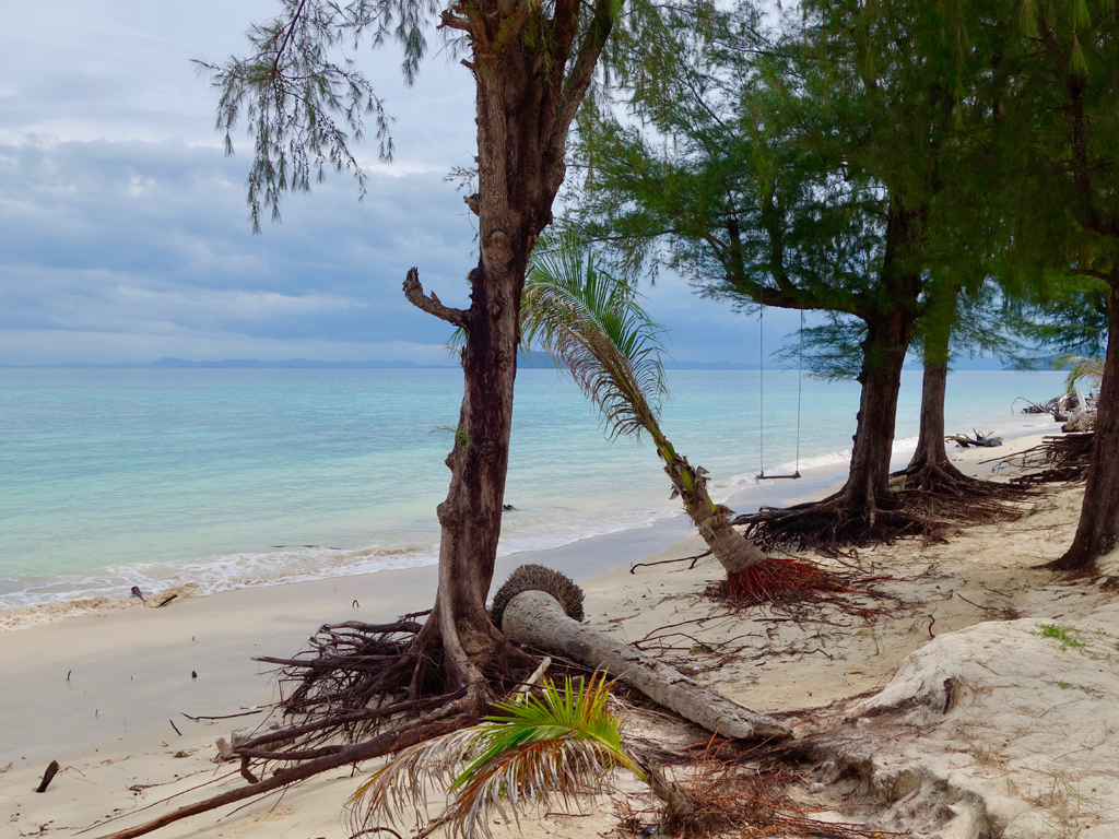 Donc, que faire sur Koh Bulone ? Rien. Il n’y a strictement rien à faire. Même pas de la plongée ou du snorkeling, le corail ayant été détruit lors du tsunami de 2004. Nous sommes restés six jours, dont trois sous la pluie durant lesquelles même un t-shirt ne sèche pas, et nous ne nous sommes pas ennuyés une seule fois. Nous avions certainement besoin de nous poser un peu, et l’absence d’activité nous a fait le plus grand bien… Six jours à observer les kalaos dans l’arbre voisin, lire un bouquin, se baigner et glandouiller sur la plage. Quel programme !