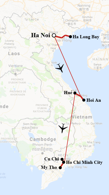 Débarqués à Ha Noi deux jours avant le tour, nous avons poursuivi avec la Halong Bay pour nous envoler ensuite vers le centre du pays et terminer par le sud à Ho Chi Minh City.