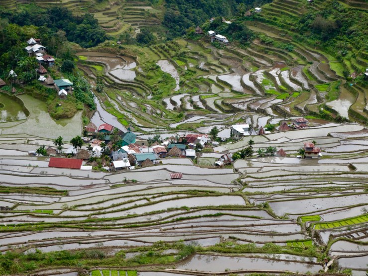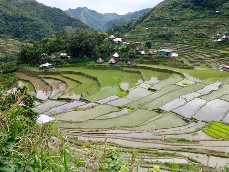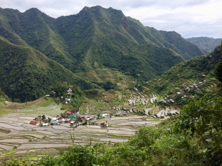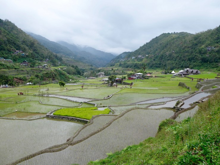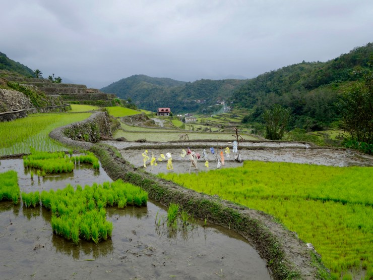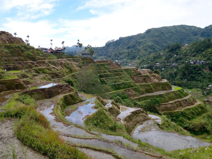 Nous partons ensuite pour le site de Batad, le village le plus connu pour découvrir les terrasses en compagnie d’un « guide », oui nous étions crevés. Bien que la fatigue nous scie les jambes, la balade est magnifique et le soleil pointe. Les rizières ne sont pas encore vertes mais en train d’être plantées. Le ciel se reflète sur les bassins remplis d’eau, ici les gens vivent au rythme des récoltes, tout est amené à dos d’homme dans le village.