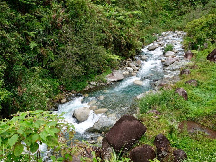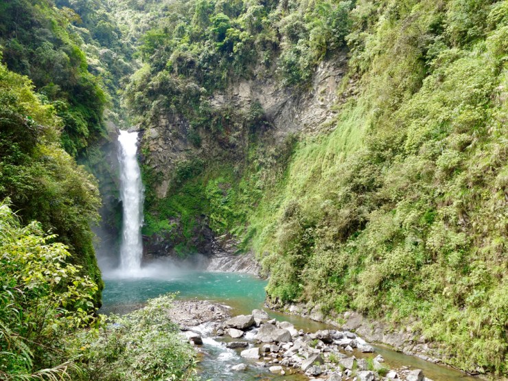 Nous descendons jusqu’à la cascade prendre quelques photos avant de remonter sous le soleil puis sous la pluie et de retrouver la route. Cette montée achève définitivement Melanie et Claudio, pas encore tout à fait remis. Nous remontons dans nos tricycles, et comble de la blague nous devons nous taper un tiers de la montée à pied car les roues de la moto glissent sur la route mouillée. Bordel mais change tes pneus avec le fric qu’on te file au lieu de bouffer du bétel toute la journée.