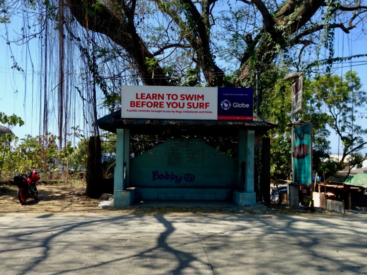 Après les au-revoir avec les Charlexs, que nous reverrons sûrement en Suisse, nous enchaînons avec un autre bus jusqu’à la petit bourgade de Urbiztondo, près de San Juan, La Union. Pourquoi ici ? Nous voulons nous essayer au surf au moins une fois pendant ce tour du monde et l’endroit est connu pour ça. En fait, il n’y a pas autre chose à faire, il n’y a que des écoles de surf et quelques pensions et restaurants-bars le long de la plage.