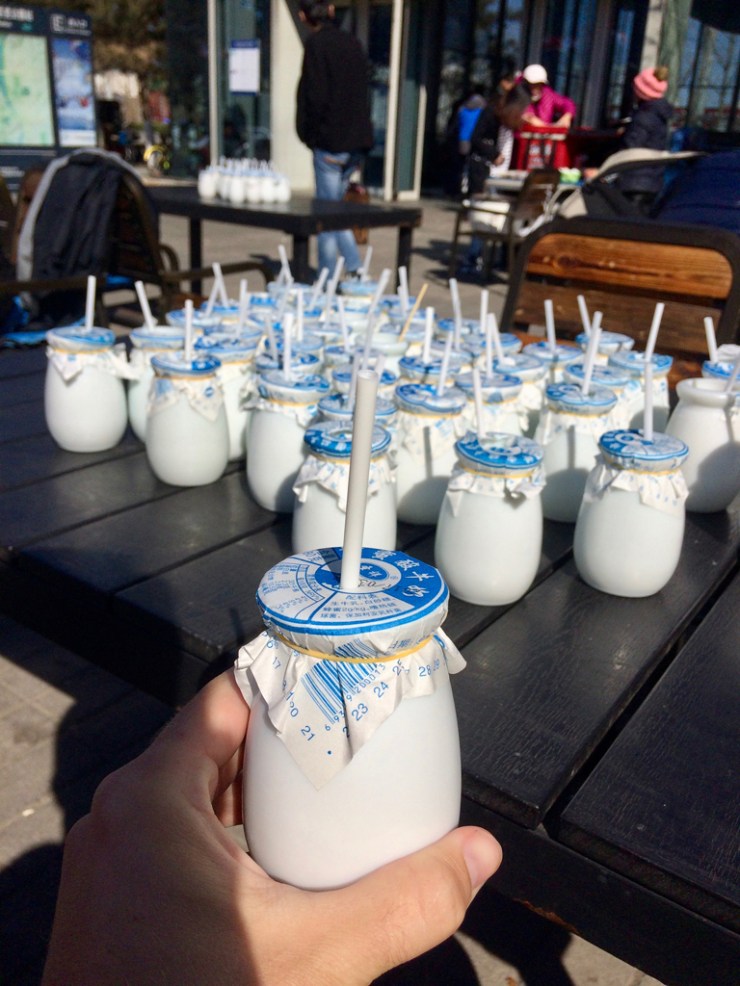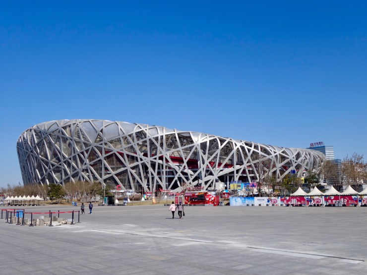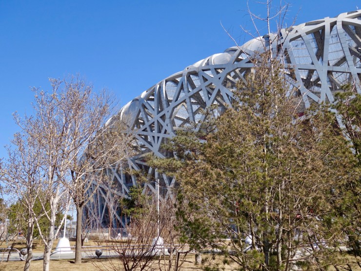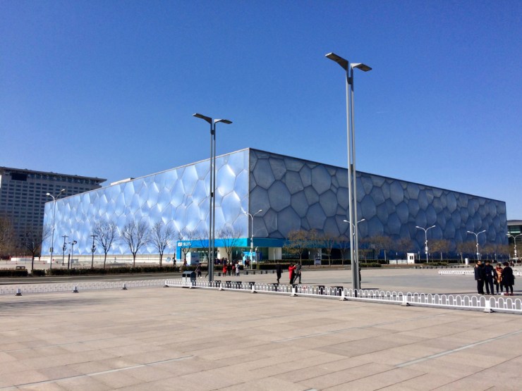 Vous devinez ce qui nous a attiré ici ? Evidemment le fameux stade nid d’oiseau des architectes Herzog et De Meuron ainsi que la piscine olympique des architectes PTW et Arup. Le site, aujourd’hui pratiquement vide, accueille des touristes et c’est à peu près tout… Le soleil brille dans un ciel bleu sans nuages (le smog pékinois est-il un mythe ?) et nous apprécions la douceur de l’air, il est tout de même difficile de quitter le climat tropical. Les deux édifices tiennent leurs promesses, depuis l’extérieur en tout cas, et sont très photogéniques. Autant que nous apparemment car nous commençons à être la cible de chinois armés de leurs smartphones. La balade est plaisante et nous découvrons une des spécialité pékinoise : le canard yoghourt ! Des tables remplies de pots en verre avec une paille qui dépasse, voilà qui a attiré notre curiosité. Pourquoi tant de bocaux ? Voilà que nous achetons une de ces pot et quel délice, un yogourt doux et crémeux à boire sur place avant d’abandonner le bocal en verre qui sera recyclé. Une merveille !