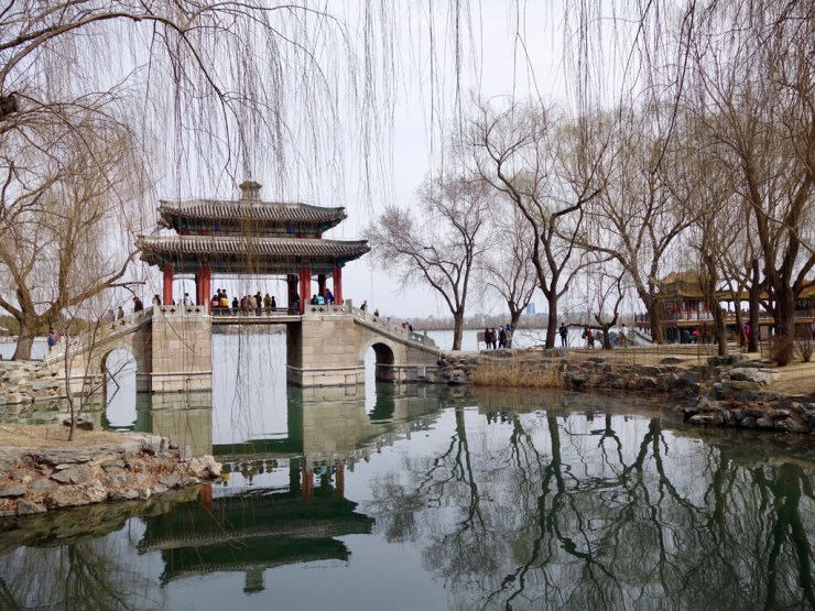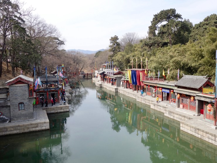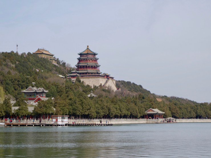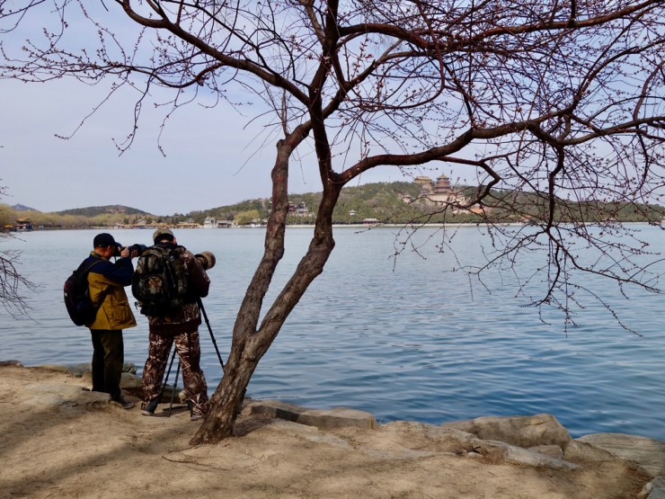 Le Palais d’été est un immense parc où les empereurs venaient s’amuser et boire des binchs en été. Plaisante promenade au soleil, avec sieste et jeu de cartes, parmi les arbres en fleurs et les habitants. On regarde les gens, on se moque gentiment des photographes en tenue de camouflage avec un matériel à 10’000 balles pour photographier une tour, on s’amuse bien… Et là, c’est le drame ! Longeant tranquillement le lac, on commence à voir une dame arrivant en sens inverse avec un mouchoir lui couvrant le visage, derrière ses lunettes avec deux trous pour les yeux. Ensuite les gens marchent plus vite et certains ont un foulard sur la figure ou carrément leur pull sur la tête… Eh oui les moustiques se sont réveillés et c’est par nuées qu’ils s’abattent sur la chair fraîche qui se promène. Une attaque de vampires en règles, sauf qu’on est en plein jour. Autant vous dire que la fin de la balade fut moins plaisante.