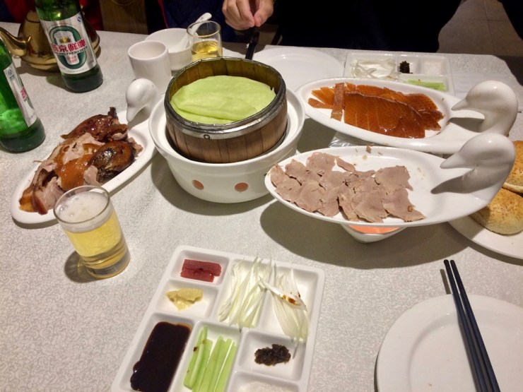 Première considération générale, la cuisine chinoise telle qu’on la connaît en Europe n’a rien à voir avec la cuisine chinoise du nord, rien ! Ici on mange beaucoup de blé, de viande, de nouilles. Nous n’allions donc pas manquer de goûter au canard laqué, la spécialité de la ville, rôti au bois d’arbre fruitier pendant de longues heures… Nous nous retrouvons dans un restaurant spécialisé et commandons la totale, soit un canard entier avec la peau croustillante. C’est beau, on reçoit des petites crêpes pour faire des rouleaux de canard et des accompagnements, sauce de prune, sucre, concombre et pâte d’ail. On copie tout de même nos voisins de table pour essayer de faire juste. Premier constat, c’est excellent ! Deuxième constat : c’est gras ! La peau (le gras donc) croustille et se mange avec du… sucre ! C’est un délice qui devient tout de même écoeurant vers la fin. La chair est tendre et avec la sauce de prune et un peu de concombre on fait de succulents rouleaux. Et on le finit notre canard, même si notre taux de cholestérol a du grimper depuis…