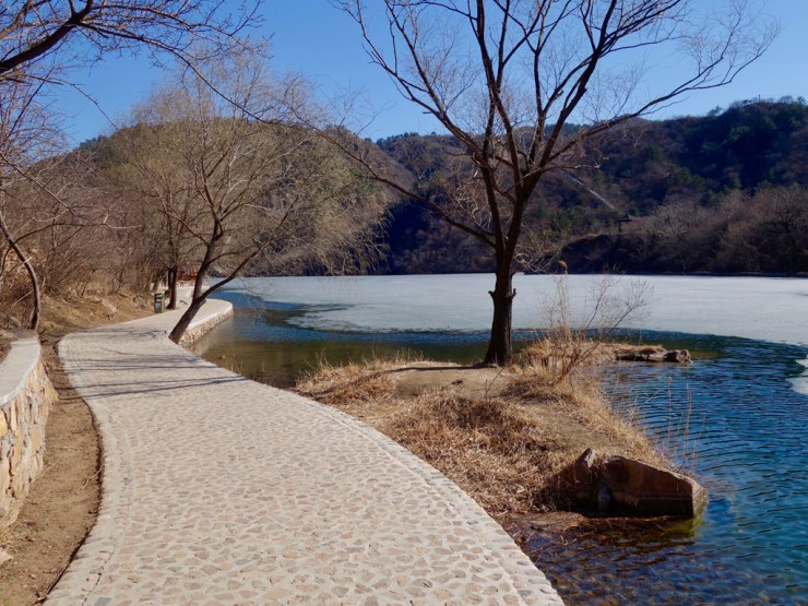 Néanmoins la déception de devoir suivre un tronçon rénové est grande, avouons-le, mais le moral remonte vite quand nous commençons à passer par dessus ignorer les barrières et à nous promener sur des anciennes parties (apparemment le cameras ne sont pas encore fonctionnelles). Certains arbustes commencent à fleurir et avec le lac gelé et le ciel bleu c’est très beau!