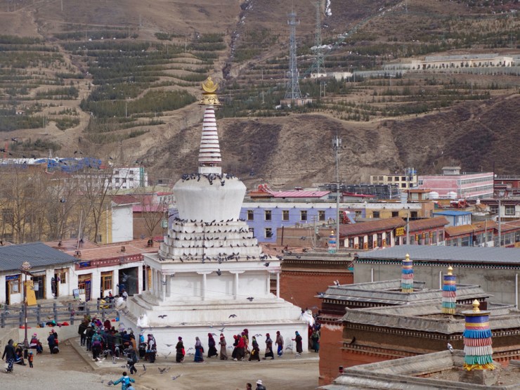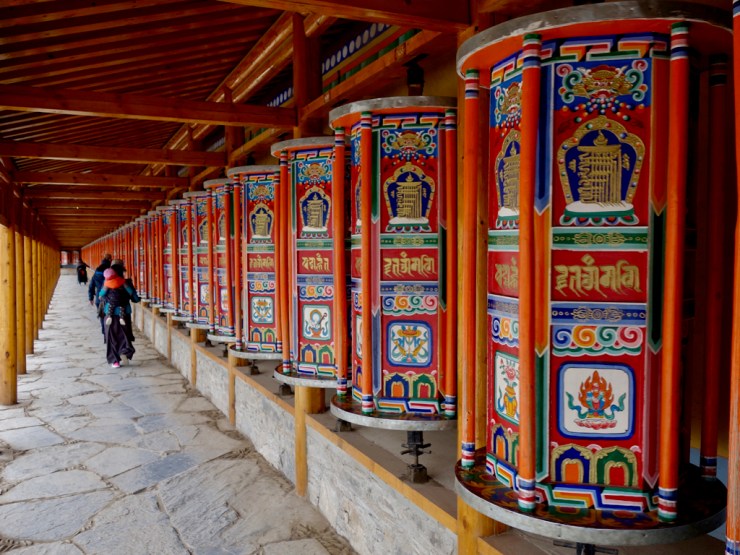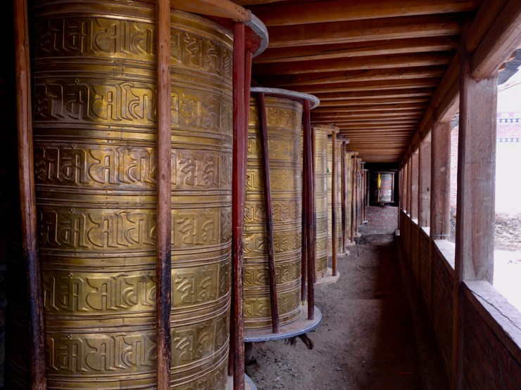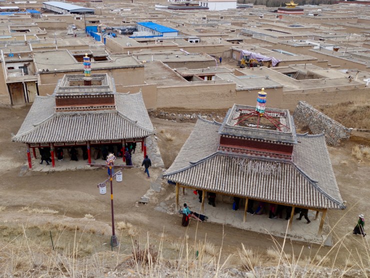 Après une nuit sur un matelas très dur mais avec de gros duvets bien chauds nous partons découvrir la ville tibétaine. L’enceinte est faite de moulins à prières et nous pouvons pénétrer dans certains temples. La billetterie du monastère principale étant fermée, nous renonçons à le visiter au profit du grand kora (chemin de pèlerinage).