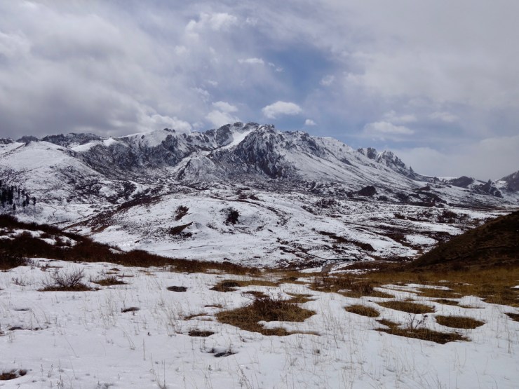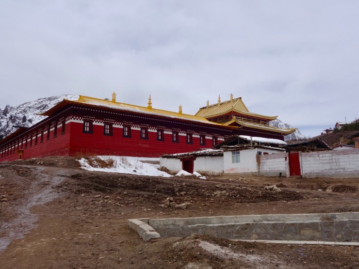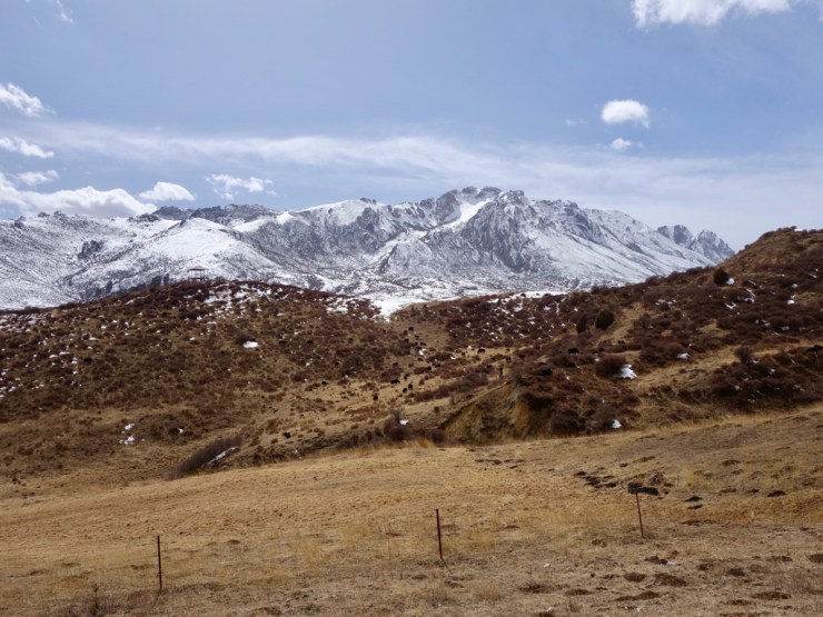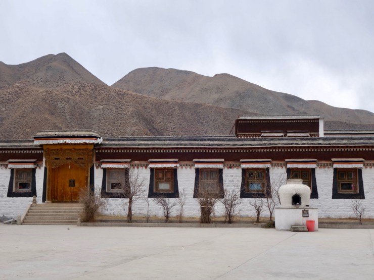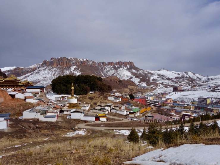 Toujours hors saison touristique, notre bus n’accueille que quelques tibétains et nous. Avant d’arrivée, un contrôle de police nous fait descendre du bus et contrôler nos passeports, on commence à ressentir les tensions qui existent entre les tibétains et les chinois. Nous arrivons dans une ville déserte, parmi les montagnes encore enneigées, à 3400m. Notre chambre n’est pas chauffée mais nous disposons de couvertures chauffantes électriques alors ça va.