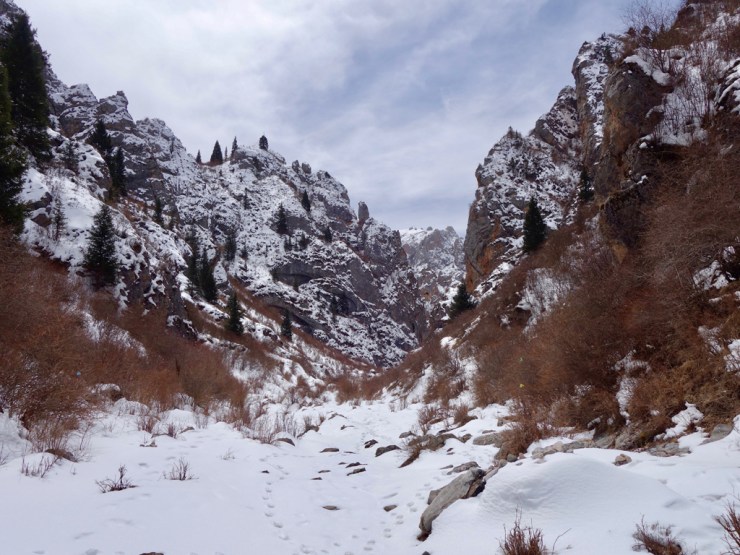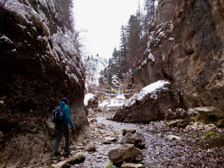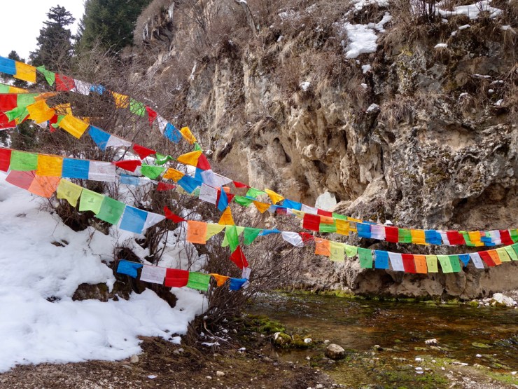 Nous trouvons un petit restaurant ouvert ou le gérant nous indique les directions pour visiter les alentours. Nous ne tardons pas et empruntons le chemin qui passe près d’un monastère. Les moines en tuniques rouges vaquent à leurs occupations et nous pénétrons dans une petite vallée enneigée parsemée de drapeaux de prières et au fond de laquelle coule un ruisseau. L’endroit est absolument paisible et nos pas dans la neige croisent des traces d’animaux sauvages. Les montagnes enneigées nous surplombent, le soleil brille…