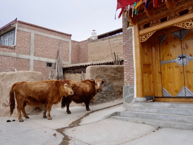 Nous choisissons le thé tibétain et le gâteau à la viande, recommandés par la patronne. Nous recevons du lait de yack chaud (un thermos de 2 litres…) et un gâteau à la viande de yack. Dire que le lait chaud ne plaît pas à Melanie est un euphémisme, mais Claudio aime bien. Le gâteau est moins pire (= moins fort en goût) mais nos estomacs ne sont plus vraiment habitués à cette nourriture de montagne et saturent vite, au grand désespoir de notre hôte.