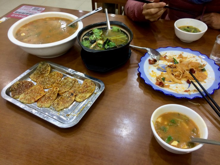En hiver au Nord, c’est un peu comme ici, les légumes sont bien cachés. Mais pas pour autant absents ! Le Pak Choi est partout avec d’autres choux, des aubergines, des châtaignes d’eau et on retrouve des plats de légumes cuisinés dans les restaurants. Par contre le prix augmente par rapport aux nouilles ou aux raviolis. Les pommes de terres nous ont également été servies. D’accord ce n’est pas un légume mais bon…