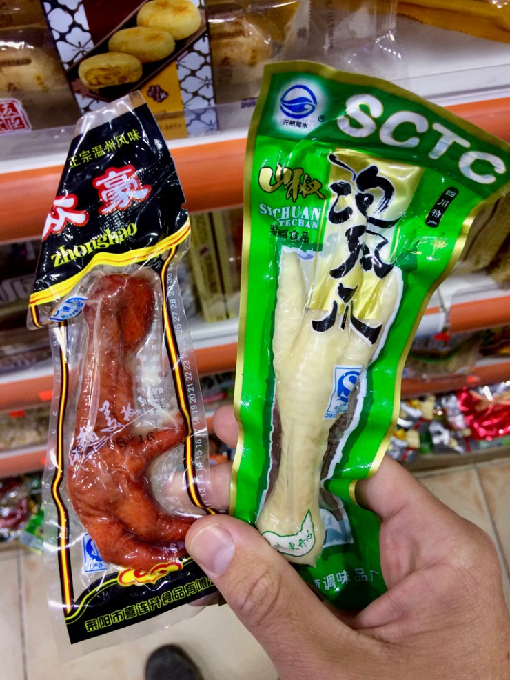 Préparer un pic-nic n’est pas chose facile en Chine si vous voulez manger un sandwich. Par contre on peut trouver tout sortes de choses emballées sous vide, super pratique pour prendre avec! Légumes, oeufs, pattes de poulets, viande et d’innombrables autres choses non identifiées/ identifiables. Si vous aimez le challenge et êtes curieux, sachez que vous trouverez votre bonheur.