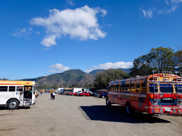 Après une bonne nuit de sommeil et le petit-déjeuner, nous voilà repartis en direction de la gare routière, située derrière le marché. Nous découvrons les bus locaux, à savoir des anciens bus scolaires des USA, certains encore jaunes, d’autres repeints et décorés comme il se doit dans un pays latino.