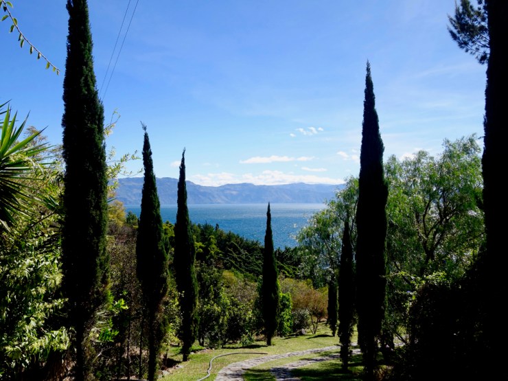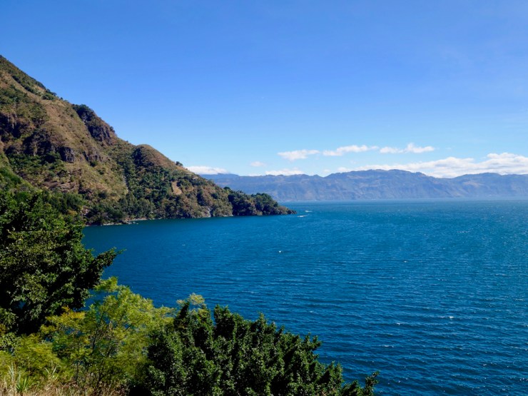 Le bon véhicule est vite trouvé, les gens sont très serviables et la destination est indiquée sur le bus. Nous changeons à Chimaltenango après un parcours de toute tranquillité sur nos petites banquettes et poursuivons sur la Interamericana vers l’ouest. Une fois le bus parti, nous nous rendons compte que le trajet ne sera pas tranquille du tout ! À peine en route, une voiture nous rentre dedans. Constat de police et c’est reparti, normal. Par contre le conducteur n’aime visiblement pas prendre du retard et se met en mode pilote de formule 1 en roulant comme un malade et en dépassant tout autre véhicule. Pour limiter encore plus la perte de temps, l’assistant (celui qui récolte l’argent des billets) sort à l’arrière et monte sur le toit pour défaire les bagages pendant qu’on roule à en tout cas 100 km/h ! Même James Bond aurait été doublé pour faire ça ! Nous prions pour notre salut prenons sur nous et attendons patiemment d’arriver à Los Encuentros et descendre de ce bus endiablé, heureusement encore vivants. La descente vers Panajachel sera par contre facile, avec une première vue sur le lac Atitlàn, surnommé amicalement Gringolandia par les guatémaltèques.