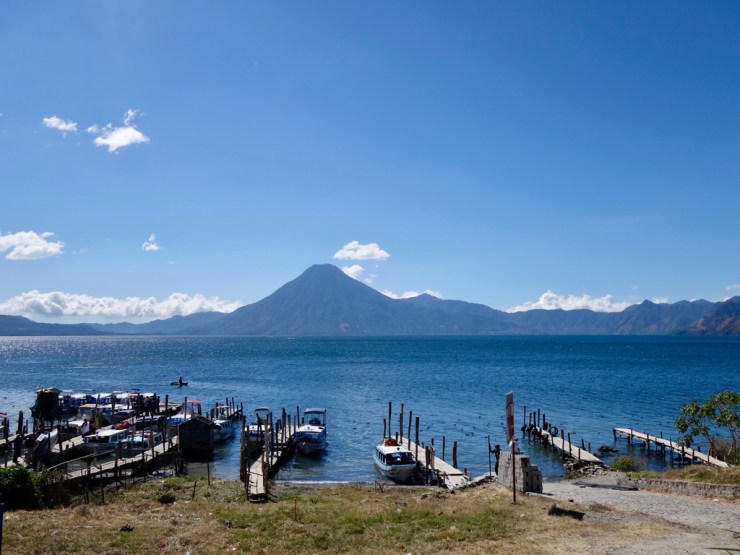Le cadre est magnifique, avec deux volcans qui dominent le lac, lui-même dans un cratère. Vu le surnom, nous nous attendons à un quai rempli de touristes avec plein de ferrys et des guides qui nous sautent dessus. Rien de tout ça, de simples pontons en bois et quelques lanchas Delta Integrale, petits bateaux à moteur, qui font le tour des villages lacustres pour un prix plus que correct.