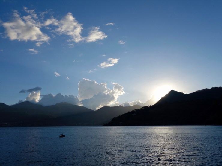 Des enfants du village nous proposent des hostals dès l’arrivée à quai et nous les suivons, ils n’ont pas l’air bien méchants, ils reçoivent juste une limonade comme commission en amenant des clients. Après deux endroits complets, nous montons sur la colline par la route et redescendons dans un splendide parc fleuri parsemé de quelques constructions blanches jusqu’à la réception située tout en bas, au bord du lac, et demandons sans vraiment y croire s’il y a de la place et combien ça coûte. Trois minutes plus tard, nous avons une belle chambre. Le rêve cet endroit ! Sans hésiter nous allons sur le ponton privé et nous jetons à l’eau, complètement seuls, alors que le soleil se couche gentiment. Ça y est, nous sommes en vacances.