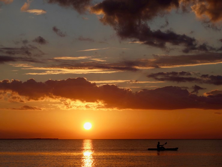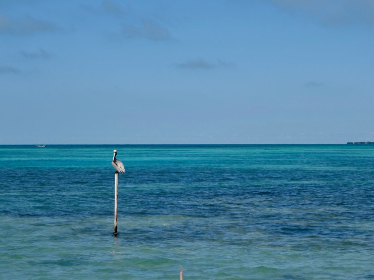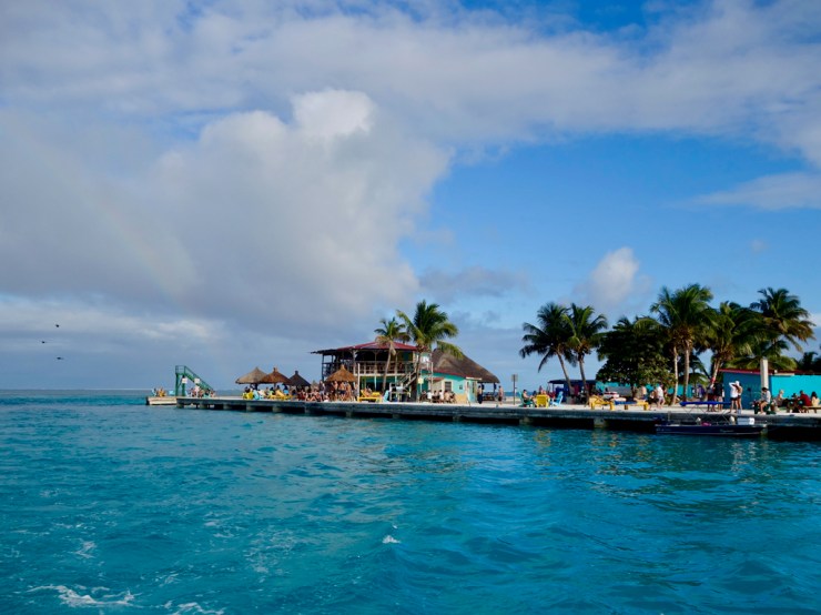 Nous partons à la découverte des lieux et ne tardons pas à arriver au « Split » l’endroît où un ouragan a coupé l’île en deux en 1961. Actuellement des renforts en béton contiennent le sable et des aménagements pour se baigner ainsi qu’un bar. Il est déjà l’heure du coucher du soleil et après avoir regardé les prix au Lazy Lizard qui ne sont plus du tout les mêmes que ceux du Guatemala, nous nous décidons d’acheter nos rafraîchissement au magasin pour les boire tranquillou sur un ponton.