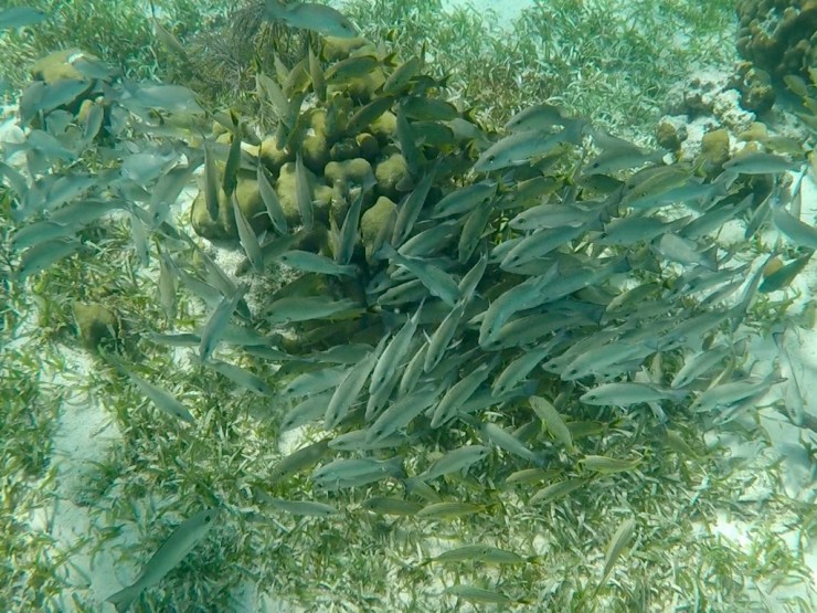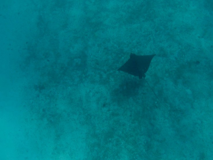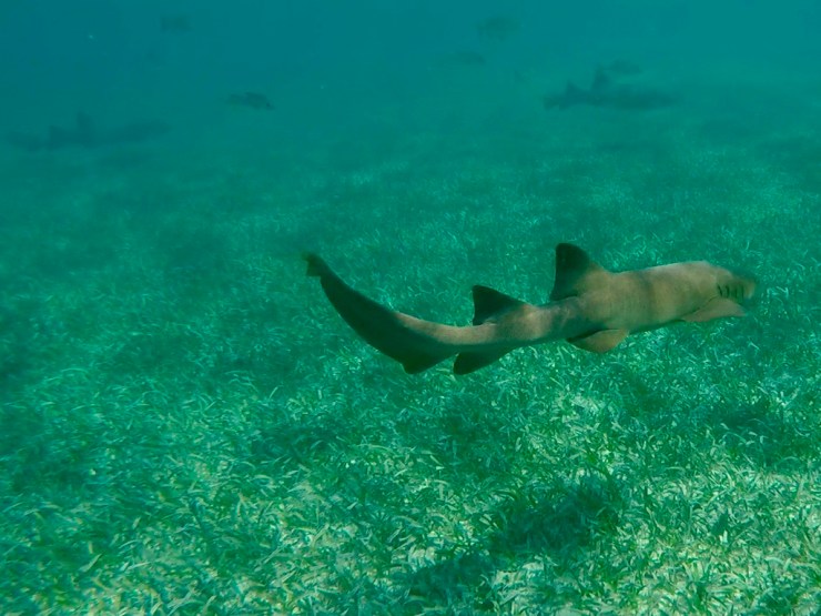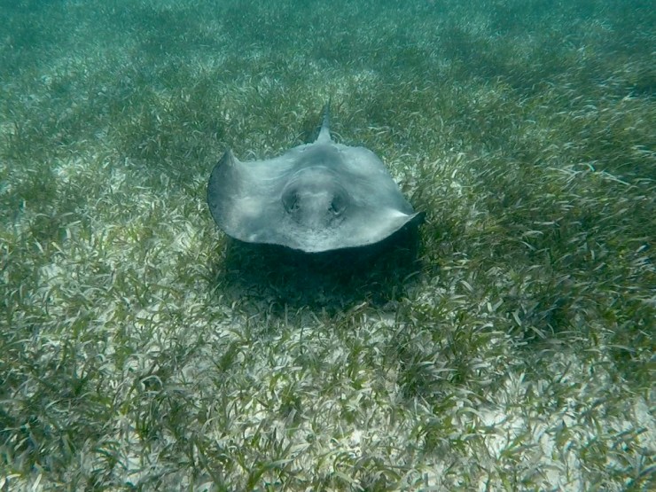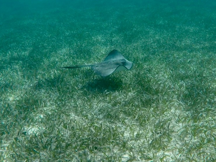 Nous sommes donc cinq, un couple d’américains, un mexicain et nous en route pour la réserve marine de Hol Chan, le premier stop. Premier stop qui nous en mets plein la vue avec des coraux encore jamais vus, une faune abondante dont des raies pastenangues et une raie léopard, des murènes et des myriades de poissons multicolores. Nous sommes enchantés et lorsque nous arrivons au deuxième stop, nous sautons dans l’eau pour nager avec les raies pastenangues et les requins nourrice. Là, nous remarquons que le feeding est pratique courante, lorsque nous jeton l’ancre les animaux arrivent tout de suite autour de nous puis voyant que nous n’avons rien à leur donner, repartent plus loin.